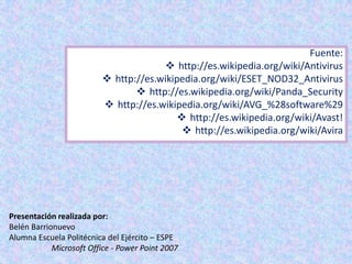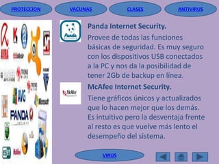 TIPOS DE ANTIVIRUS Y SU CARACTERISTICAS by juan diego alanis TIPOS DE ANTIVIRUS Y SUS CARATERISTICAS JUAN DIEGO ALANIS DIAZ Braulio Israel Buenrostro Vazquez Juan Manuel Godinez Guzman ADOLFO JAFET LOZANO ROCHA GERSON NEGRETE ROCHA PRINCIPALES TIPOS DE ANTIVIRUS Topic CLASIFICACIÓN: ANTIVIRUS PREVENTORES: como su nombre lo indica, este tipo es.wikipedia.org › wiki › MalwareMalware - Wikipedia, la enciclopedia libre Los términos antivirus y anti-malware se utilizan a menudo como sinónimos ya que los virus informáticos son un tipo específico de malware. Tipos de software anti-malware: Antivirus. Son programas que detectan y eliminan o bloquean la actividad de malware. Puede proteger de varias formas: [95] Los 10 mejores antivirus de computadora en el mundo | Solo ... 1 1 - Norton Internet Security Es el mejor para la seguridad al navegar por internet. Una de sus principales características es la detección de 'malware', la cual se basa en el análisis de su comportamiento como una amenaza. 2 - Kaspersky Internet Security Clases De Antivirus - SlideShare Clases De Antivirus 1. Panda Antivirus Pro 2010 La nueva versión de Panda Antivirus Pro 2010 ofrece la protección más fácil de usar contra virus, spyware y hackers, además de incluir un nuevo motor contra el robo de identidad.