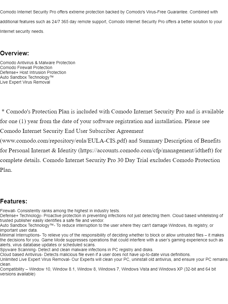 Download Internet Security Products for PC Protection Comodo Antivirus - $29.99/year Why download a free antivirus that barely protects you, when you can have it all for $29.99/year? Award-Wining Firewall Next-Gen Antivirus Live Expert Virus Removal Secured Online Backup Remote Help 24x7 Prevents from all infections GET NOW Got more than 1 PC? Get 3 Licenses for $39.99 Learn More