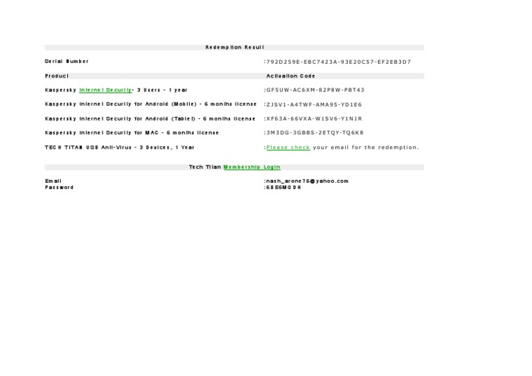Redemption Activation Key For Kaspersky - Antivirus Software - Scribd Redemption Activation Key for Kaspersky - Free download as Word Doc (.doc / .docx), PDF File (.pdf), Text File (.txt) or view presentation slides online.
