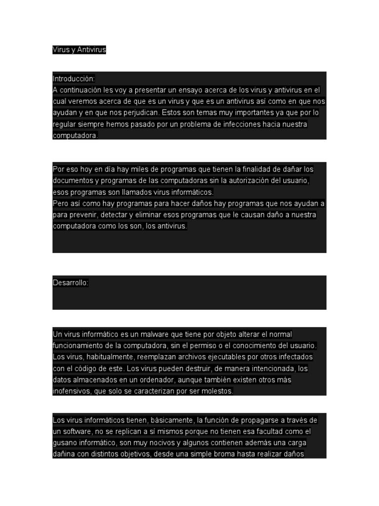 Virus y Antivirus - Tecnología Digital - Google Sites Los virus son programas informaticos que tiene como objetivo alterar el funcionamiento del computador, sin que el usuario se de cuenta. Virus y Antivirus - Monografias.com Virus y Antivirus · Son programas de computadora: En informática programa es sinónimo de Software, es · Es dañino: Un virus informático siempre causa daños en el ... VIRUS Y ANTIVIRUS - Eumed.net Los virus informáticos son programas que se introducen de forma subrepticia en un ordenador para ejecutar en él acciones no deseadas por sus usuarios ...