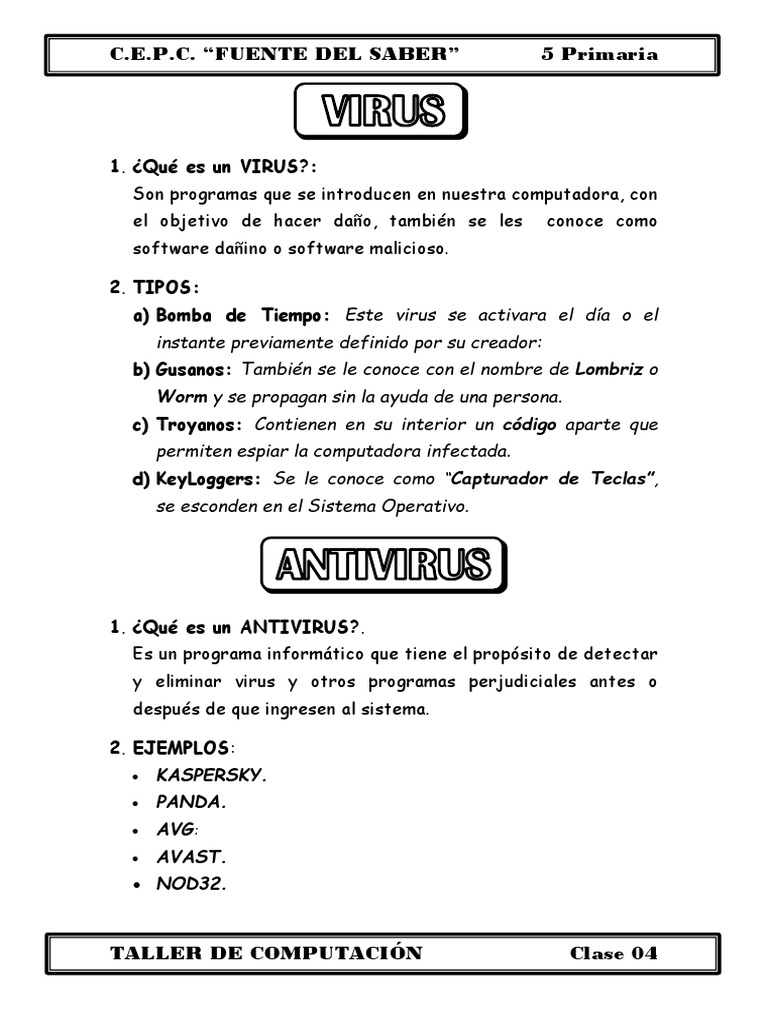 Qué es un virus y antivirus. Virus informáticos y antivirus: ¿Que es un virus informático? Los virus son programas informáticos que tienen como objetivo alterar el funcionamiento del computador, sin que el usuario se de cuenta. VIRUS Y ANTIVIRUS INFORMÁTICOS Jan 30, 2015 ... El software antivirus es un programa de computación que detecta, previene y toma medidas para desarmar o eliminar programas de software ... Virus informáticos y antivirus: ¿Qué son los antivirus? - GCFGlobal Los antivirus son programas que fueron creados en la década de los 80's con el objetivo de detectar y eliminar virus informáticos. Antivirus. Virus informático - Wikipedia, la enciclopedia libre Un virus informático es un software que tiene por objetivo alterar el funcionamiento normal de cualquier tipo de dispositivo informático, sin el permiso o ...